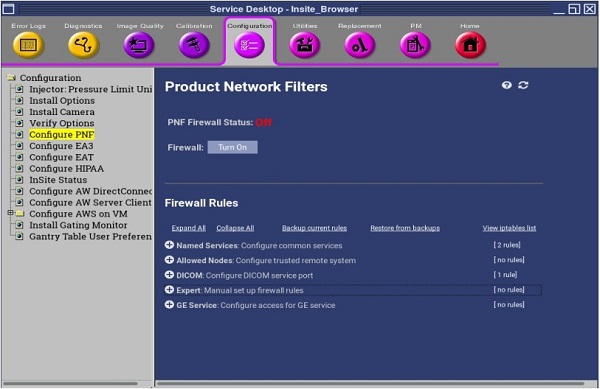 Product Network Filters (PNF) is a software tool that allows a site Network Administrator to control traffic from the site's internal network to the Diagnostic Imaging System.