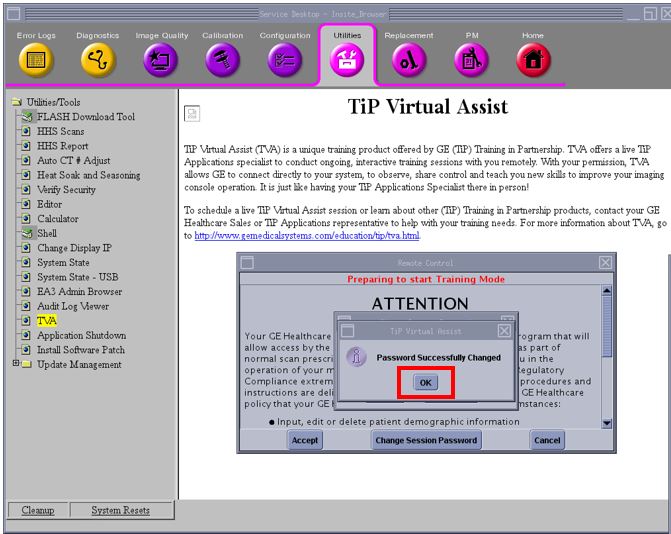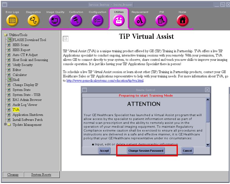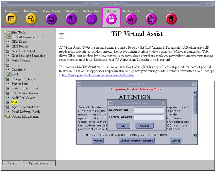 This procedure describes the steps to set a new password for the Tip Virtual Assistance (TVA). Whenever TVA usage is needed then it is recommended that a new password should be set. There is no means to remember/retrieve the previous password, if it is forgotten or lost.