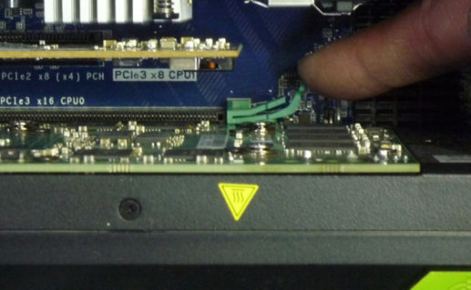 - Disconnect the power cable from the Recon GPU card, press the card slot release lever and pull out the old Recon GPU card.note: Lift up the card latch when removing the card. (See Figure 4)