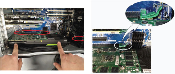 - Connect the power cable to GPU Card, confirm it is firmed connected and fix it to avoid vibration or loose