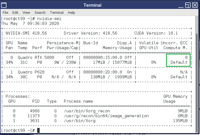 - If the GPU ECC is ON, below is what the output would look like (boxed in green):