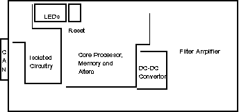 The “Core controller” shares functionality with the controller section of the Data Acquisition Control Board (DCB). The core section consists of the processor, clock and clock processing, RS232 circuitry, Flash memory and RAM.