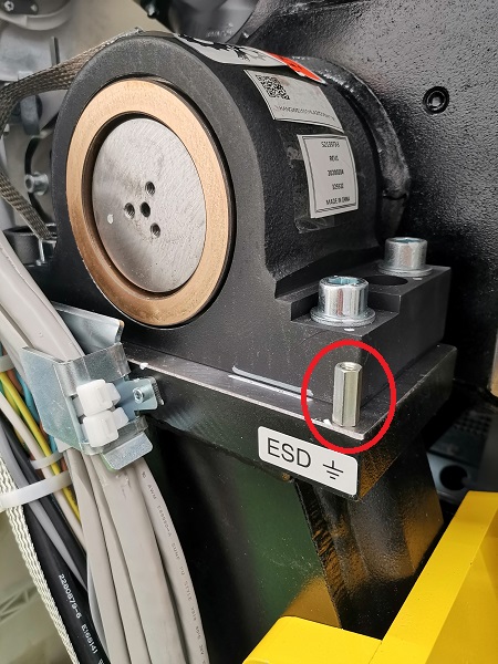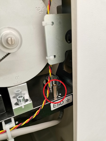 The CT gantry has defined ESD attachment points that allow easy attachment for banana clip and alligator clip style connections. There are points on the stationary frame on each side of the gantry. The stationary frame locations should always be used if the length of your ESD strap is sufficient.