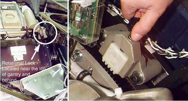 The rotational lock is located on the rear side of the CT Gantry, near the top. It is positioned directly across from the teeth in the rotational assembly. To operate the lock: