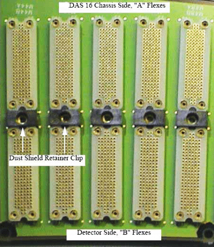 The backplane used on the DAS is separated into three sections: Right, Center, and Left. The three backplane boards are connected via a ribbon cable, with a 100–pin connector on each board. The GDAS-16 backplane is different from the MDAS backplane in its structural features to allow use in faster gantry rotation speeds.