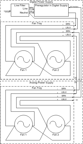 The GEMS-IT power supplies require fans for cooling. The Astec power supply configuration does not. For the GEMS-IT power supply configuration, two fans in each power supply chassis are attached to a removable tray that can be replaced without removing the power supply from the rotating base. (There are no air filters to clean for either power supply configuration). The fans are connected by white molex connectors with an interlock line such that the supplies will not turn on if the fans are not connected. See Figure 6 for details.