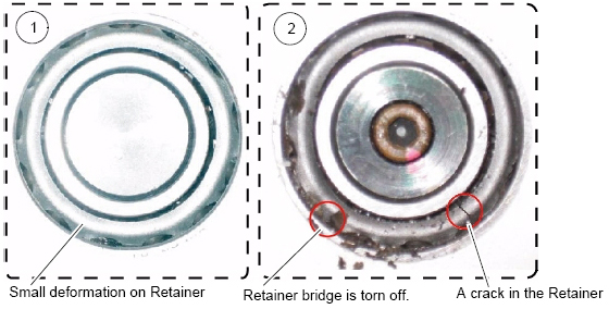 1. Visually check the retainer of the bearing for damages and deformations (see #SL2197698-1066498 and #SL2197865-1066498).