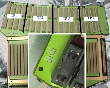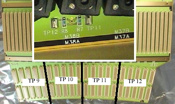 Each distinct backplane has been divided up into 4 groups of modules, each group having its own limiting resistor and test point. This is to make finding the shorted module easier. Each test point is referenced to the DAS center chassis TP 4 AGND test point.