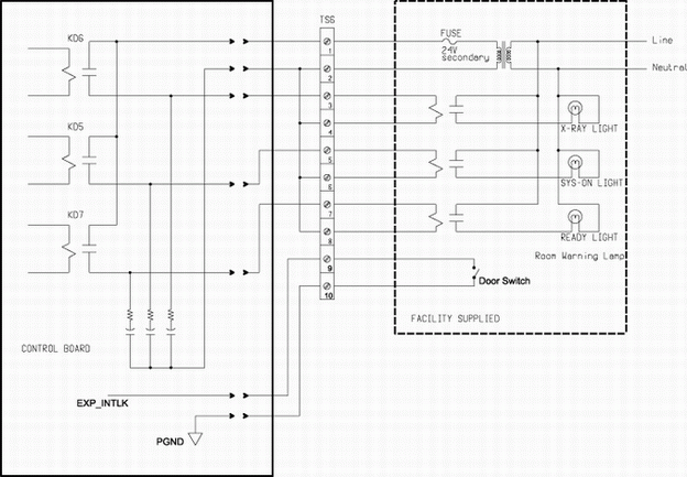 Terminals 1 through 8 are used for connection of external hospital room warning lights as described below. Terminals 9 & 10 are used for connection of a room door interlock switch in the system x-ray enable circuit.