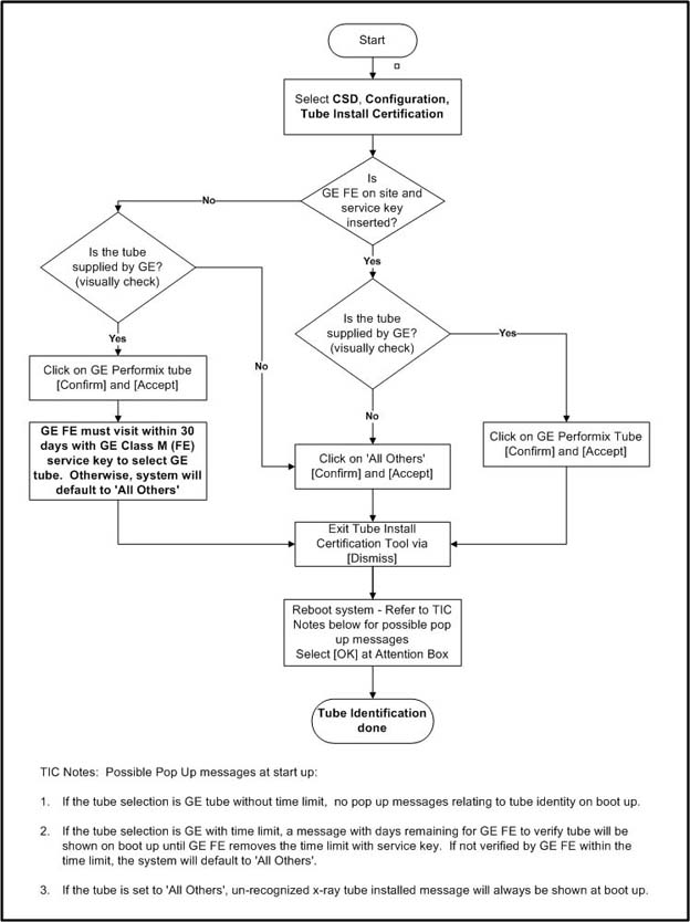 When installing a new tube it will be necessary to utilize the new Tube Install Calibration (TIC) tool. The tool is in Common Service Desktop under Configuration. Follow the process shown in the Process Flow section of this document. You will need to select Tube Identity (“GE Medical Systems Tube” or “All Others”) using the Tube Install Certification Tool. It will be necessary to insert the GE Employee Service Key (Class M) in order to permanently authenticate the tube as a GE supplied tube.