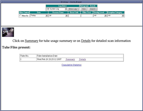 The System Browser is used to display information about the currently installed tube as well as previously installed tubes. The Tube Usage viewer provides three different levels of information viewing for Tube Usage: Summary, Details, and Cumulative.