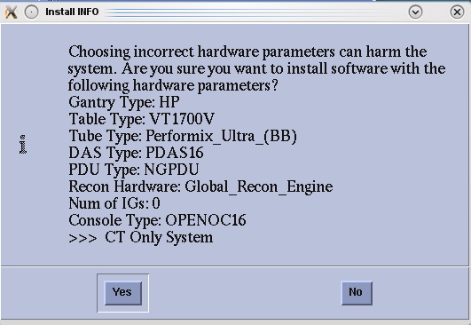 note: If a valid and current system state backup media is not available, select No and manually configure the Hardware Tab to define system and console type in accordance with the procedure Manual Configuring System INFO. - System state (Install INFO) media type decision window will