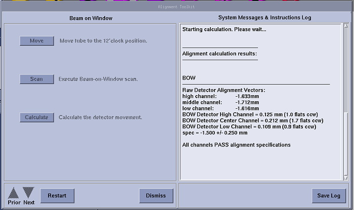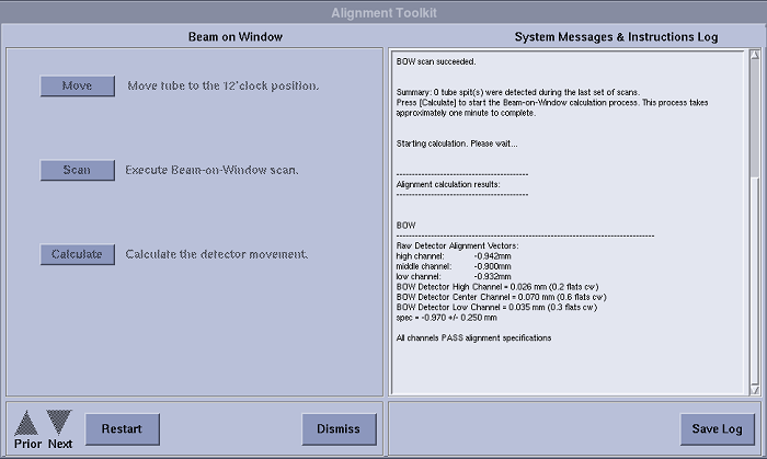 note: The specs for BOW are checked by the software. If an adjustment is needed for the first BOW scan, make adjustments per procedure. In the verification scan, the spec is different than the software version because the tube is warm.