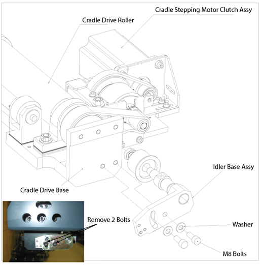 6. Remove two (2) M8x20mm bolts and washers to release the Idler Base Assy from the Cradle Drive Base.