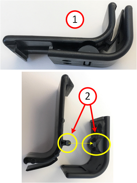 The replacement latch kit is shown in Figure 1 below. The movable lever (Item 2) is designed to be removed for access to the mounting screws by popping the lever pivot arm from the latch base plate (Item 1). The lever can be easily pop off if the cradle extender is placed on a hard surface in a rough and haphazard way, leading the customer to believe either the latch is broken, or simply pops the lever back in place. Over time the lever pivot arm or the mating slot on the base plate becomes worn and the assembly must then be replaced.