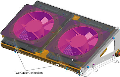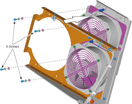 - Install the fan assembly with attachment bracket to the top fan frame using the 4 screws.