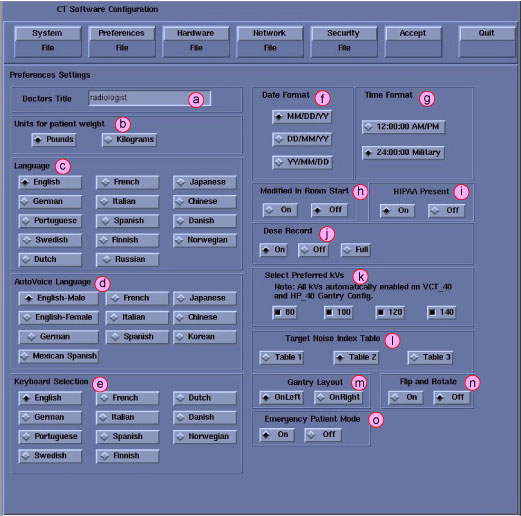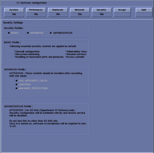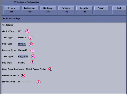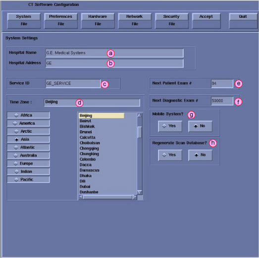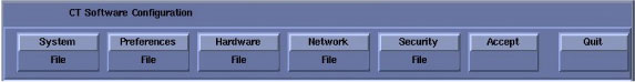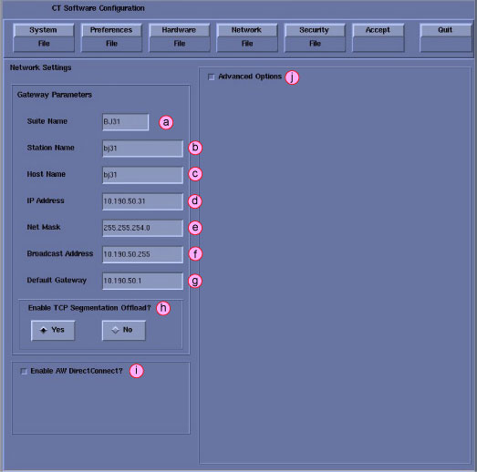 note:This screen provides the ability to declare the CT system on a hospital network. Key information such as Host Name, IP Address, Net Mask (for CT systems on a subnet) must be obtained from the hospital network administrator.