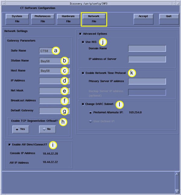 This screen provides the ability to declare the CT system on a hospital network. Key information such as Host Name, IP Address, Net Mask (for CT systems on a subnet) must be obtained from the hospital network administrator.