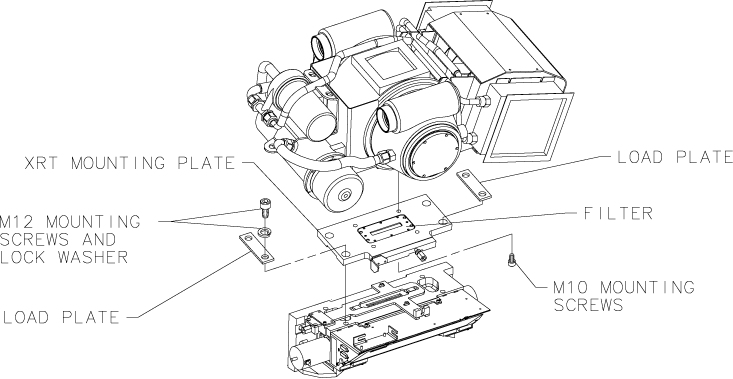 - The XRT is attached to the Collimator with a Tube Mount Bracket Assembly. Remove the mounting plate & XRT from the Collimator by removing the four M12 cap screws and lock washers, and two load plates, with a hex socket driver. With your hand, reach behind the radiator to the screws from either side of the XRT center section while removing the bolts with two 12-inch extensions (24 inch length) on a ratchet. Throw these M12 bolts and washers away, as they should not be reused.