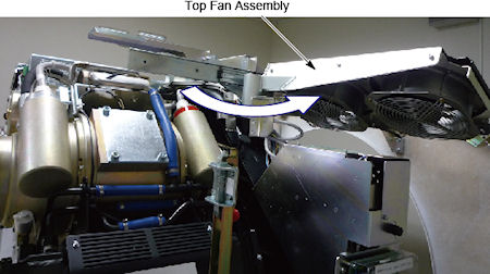 - Slide out the gantry rear cover, and rotate the top fan assembly