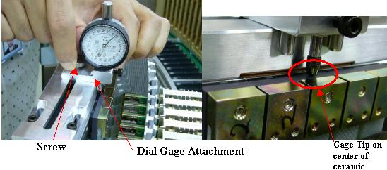 3. Loosen the screw for dial gage attachment and align the tip of the dial gage to the center of the ceramic substrate on the module to be moved. Then finger tighten the screw for dial gage attachment. See Figure 5.