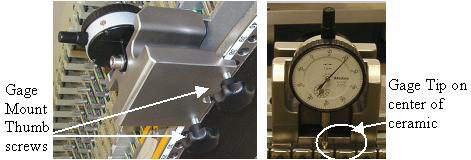 3. Tighten the thumbscrews on the back of the fixture enough to prevent any movement. Gently wiggle the mount block to make sure the gage reading does not shift around more than 2-3 microns. This makes sure the gage is tight on the rail.
