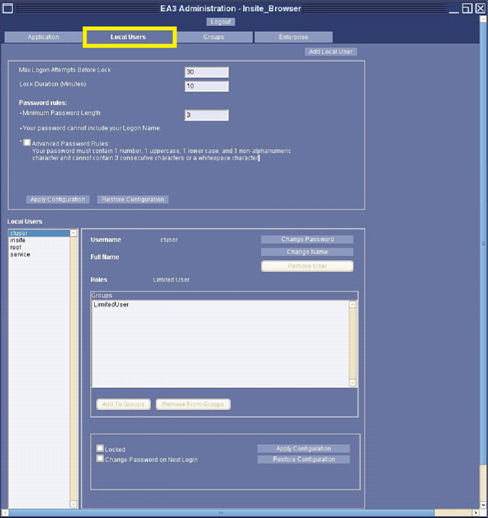 A detailed explanation and instructions on configuring Local and Enterprise User Accounts for the system using the EA3 Admin Browser Utility can be found in the System’s User or Learning and Reference Guide Manuals. The EA3 Admin Browser Utility is the tool used for configuring User Accounts.