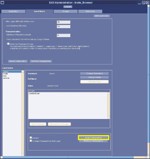Figure 13. EA3 Admin Browser, Local User Page – Apply Configuration