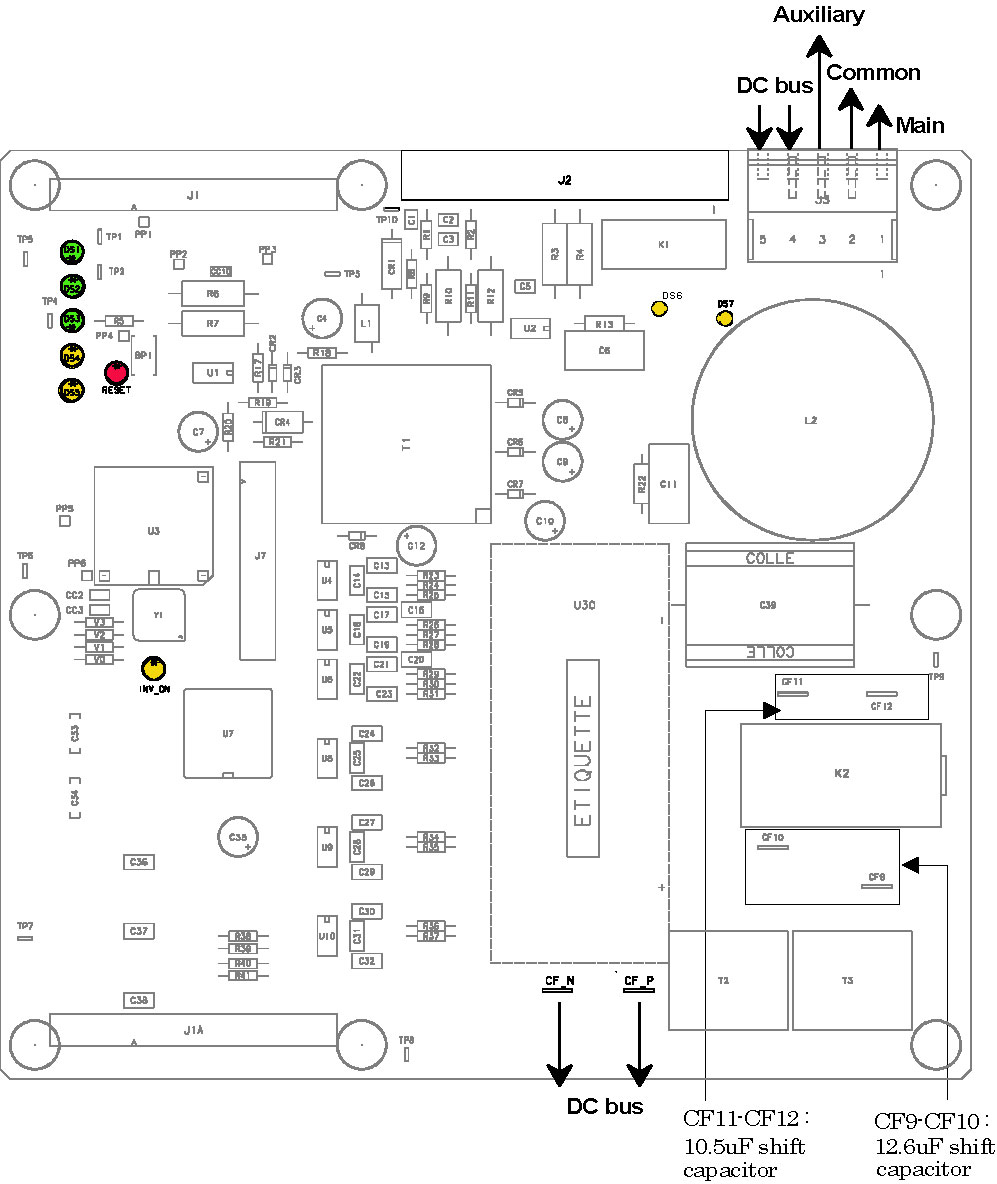 Application mode: LEDs DS17 to DS24 are lit successively more slowly. The power up self tests are completed, PPC kV control board is up and running.