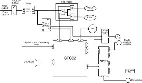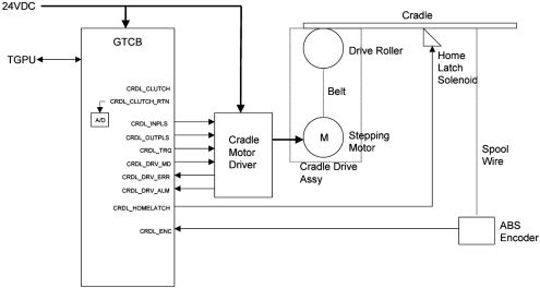 Control of this cradle drive system is provided by the GTCB and stepping motor driver. The GTCB generates the IN/OUT drive pulse and sends torque control signals to the stepping motor driver. The stepping motor driver drives the cradle stepping motor. The motor turns a drive roller at the front of the table on which the cradle rests via drive belts, thus causing the cradle to move.
