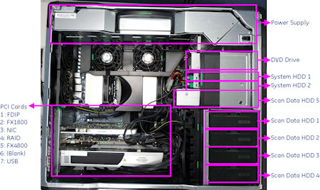 Five Scan Data Disks are connected to the RAID card that enables hardware RAID5 (approximately 512 Gigabytes).