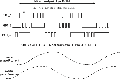 Inside this "fundamental" command frequency, the IGBTs commands duration is modulated to get the right level of current in the phases.