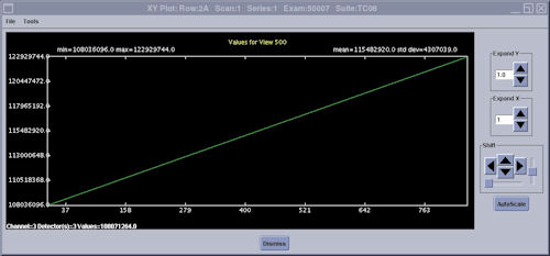 Data pattern test results for the CDCB boards can be viewed using Scan Analysis. Note the Exam and series for the desired test to view in the result screen of the Scan Data Path GUI. The following example screens show the data patterns to be expected from each test. The data patterns shown are the View Vs Channels (VVC) plot of one channel using all default settings within Scan Analysis. All Channels will look the same.