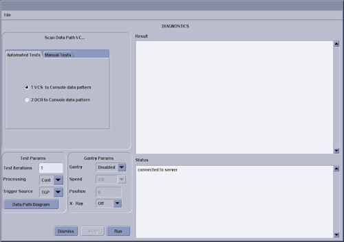 There are two main tabs on the top left for Automated and Manual test selections. The automated test selections run without any user intervention. The manual tests require manual intervention such as loopback testing that requires manual cable connection changes. Grouped in with the manual tests is also the Power supply reporting that checks all power supply voltages in the DAS/Detector subsystem.