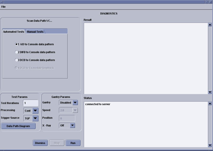 There are two main tabs on the top left for Automated and Manual test selections. The automated test selections run without any user intervention. The manual tests (if existing per configuration) require manual intervention such as loopback testing that requires manual cable connection changes. Grouped in with the manual tests is also the Power supply reporting that checks all power supply voltages in the DAS/Detector subsystem.