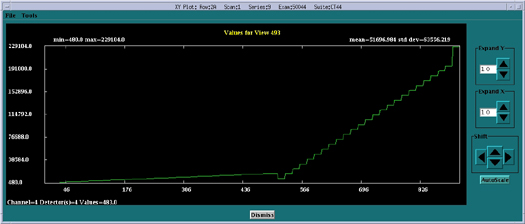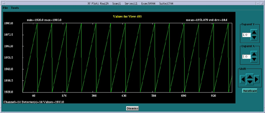 Data pattern test results for the A/D, DIFB, and DCB boards can be viewed using Scan Analysis. Note the Exam and series for the desired test to view in the result screen of the Scan Data Path GUI. The following example screens show the data patterns to be expected from each test. The data patterns shown are the View Vs Channels (VVC) plot of one channel using all default settings within Scan Analysis. All Channels will look the same.