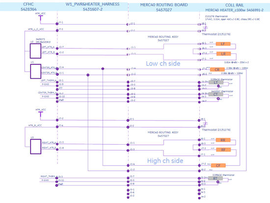 Since CFHC does not have current sensor for rail heater, the board cannot detect the rail heater open/short issue. If one or more failure is detected, heater or thermistor may be damaged. The following material shows the heater connection wiring diagram. And System level resistance table.