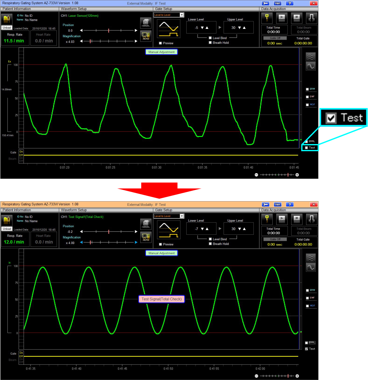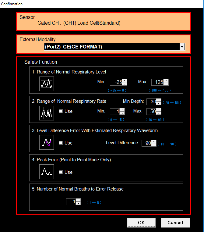 - Select: "Test" and output Test Signal. Then, adjust Test Singal Respiratory Waveform.