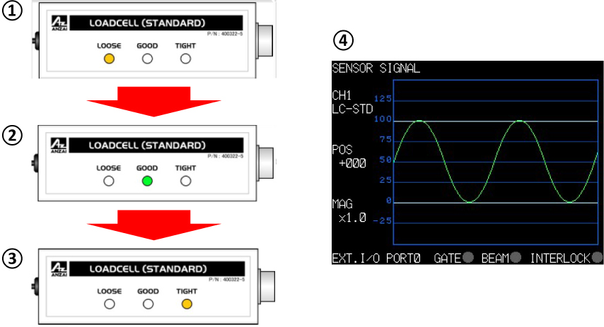 Notice that the indicator will change from LOOSE to GOOD to TIGHT when varying the amount of pressure applied. If this does not occur check cables and the possibility of a bad Load Cell Sensor. Make sure that the waveform changes with the amount of pressure is displayed on LCD Panel of Sensor Port.
