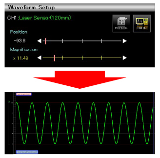 - Click “AUTO” icon to automatically adjust the Position and Magnification parameters. The green waveform will eventually settle itself between the red lines.