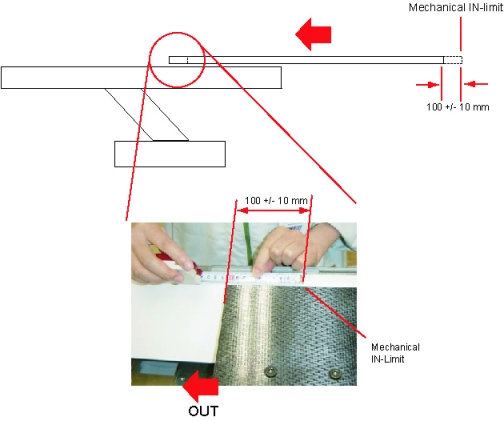 11. Move the cradle manually to the mechanical OUT-limit position, then move it forward 100 +/- 10 mm.