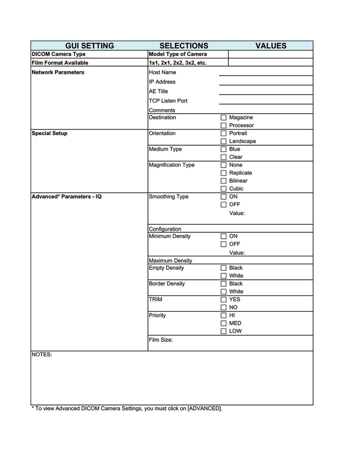 For more information on the proper settings for these parameters, please see the camera’s DICOM Print Device Conformance Statement or the Camera Manufacturer Representative.