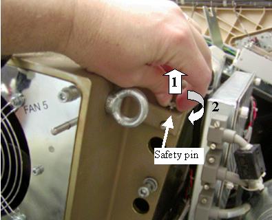- Pull up on safety pin small knob and rotate ¼ turn to