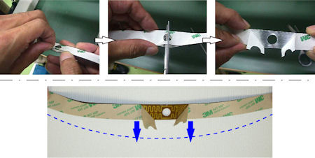 - Peel the backing sheet a few centimeters at the center portion of the heater, and make a cut in the backing sheet, then bend the backing sheet toward the outside of arc of the heater.
