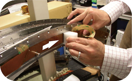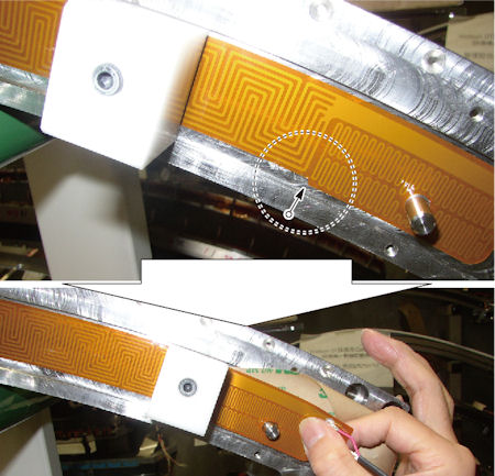 - Peel away the backing sheet of the heater gradually, and move the attachment tool along the groove in the side of the collimator rail to attach the heater to the collimator rail.