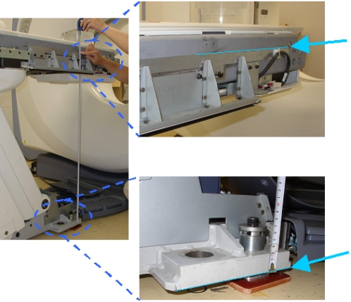 - Using the Service Switches, move the table at 700 +/- 0.5mm of the distance between characterization points. The distance measured is between the bottom of the Table base (not floor) and the top of the characterization plate. See Figure 6.