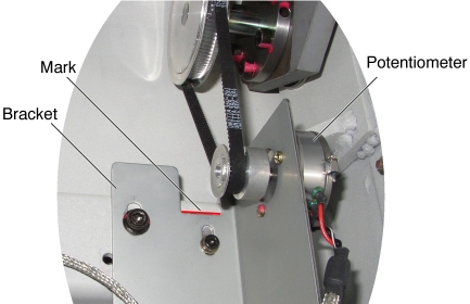 19. Align the surface of the bracket with the mark, and tighten the 2 screws, to fasten the potentiometer assy , with tension on the belt.