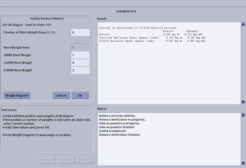 13. Follow the steps as stated in the “Result” portion of the GUI screen as you proceed through the Gantry Balance procedure. Those steps will not be included here as they may change from release to release of the product.