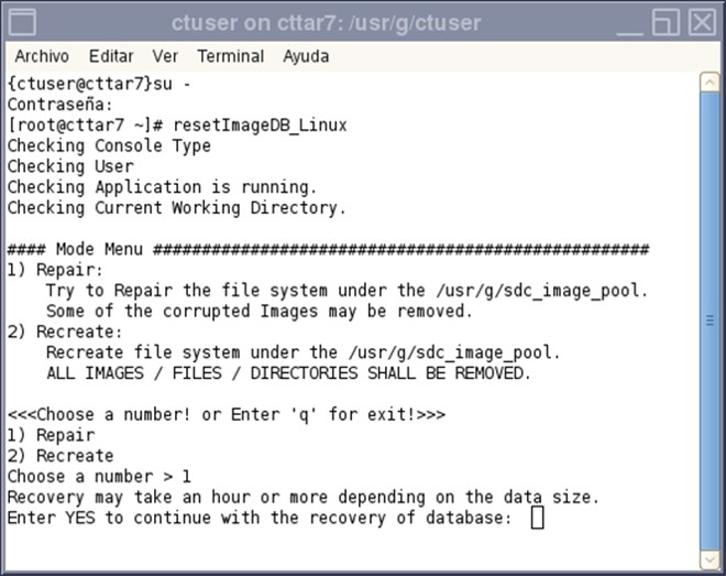 - When Repair is selected, the caution message is displayed about the time for recovery. The required time for recovery depends on the number of images on the Console. Enter “YES” and press enter if it’s OK.note: