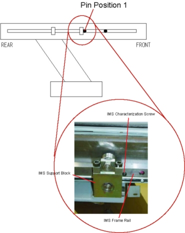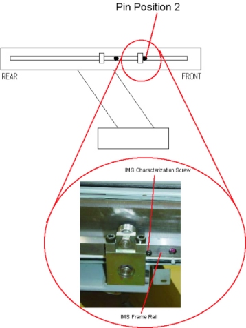 9. Insert the IMS characterization screw into the frame rail (Position 1) as shown, then move the table until the screw touches the IMS support block.